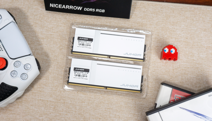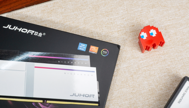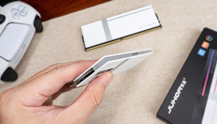 通过马甲贴着的标签可以得知,玖合异刃DDR5 8000 RGB灯条的时序为C36-48-48-126,频率8000MHz,工作电压1.5V,单条容量16GB。从规格上来看中规中矩,不过内存搭载了PMIC电源管理芯片,不锁电压,为进阶玩家预留了操作空间。