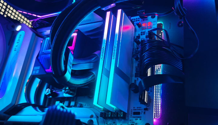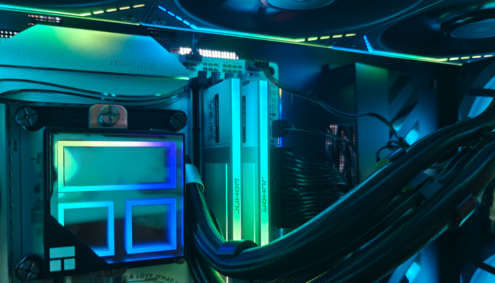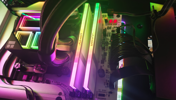 作为灯效系统的组成部分,玖合异刃DDR5 8000 RGB内存条在光影表现上确实能带来惊喜,动态光效的组合变化能精准营造多样化的氛围场景。