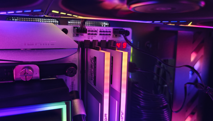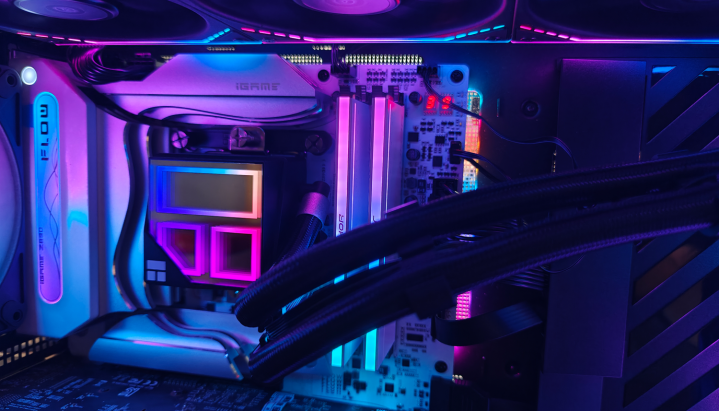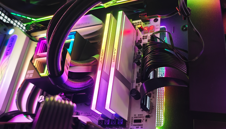 本次测试使用Intel Ultra 265K处理器,搭配七彩虹Z890平台。玖合异刃DDR5 8000 RGB灯条上机后,不仅顶部的RGB导光条会自动点亮,包括侧面的透明处也会发光,整体会以颜色过渡方式变化。