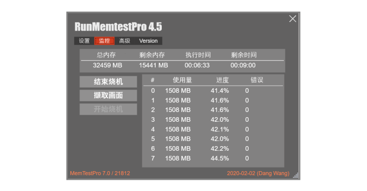 使用RunMemtest Pro烧机,玖合异刃DDR5 8000 RGB灯条通过所有测试,这表明它能够在8200MHz频率下稳定运行。其实在跑至20%时,没有跳错就基本不会有问题,一般不稳定都会在15%进度前。